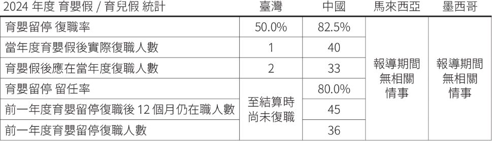 1.育兒假:依地區法規,中國廠區幼兒3歲前每年5天或10天有薪假(依服務當地城市提供)。