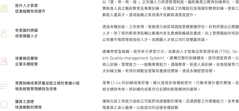 2021年起,英濟透過本職技能、工作表現、發展潛力與區域調度意願整體評估,針對評選出之關鍵人才,除了提供薪資津貼輔以集團內各生產據點輪調及養成。此外,每年11月定期執行集團各事業經營檢討會議,揭露各事業單位營運狀況及人才培育相關情形;同時,各事業單位亦設置輪職主席制度,作為高階人才接班之重要機制。在管理職能的培訓以培養中階管理與技術人才,有利人才銜接與區域調度,並可透過培育合約強化留才能力,為關鍵人才與公司打造雙贏局面。
